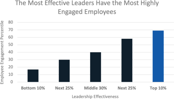 Since then, 627 of the organization’s leaders have completed the 360-assessment and development experience. Ninety-seven percent of the participants agreed—with 80 percent strongly agreeing—that “The design of this course (teaching methods, activities, materials) provided an effective way for me to learn this subject matter.” Similar percentages also agreed that the facilitators were effective at delivering the material. More importantly, we wanted to know what impact The Extraordinary Leader initiative had on the organization, its leaders, and its employees. The Medical Center’s dataset of 627 leaders in Health Care was analyzed and uncovered powerful results. Research reveals the dramatic effect that leadership effectiveness has on employee engagement. In the chart below, you see that the best leaders have the most highly engaged employees.